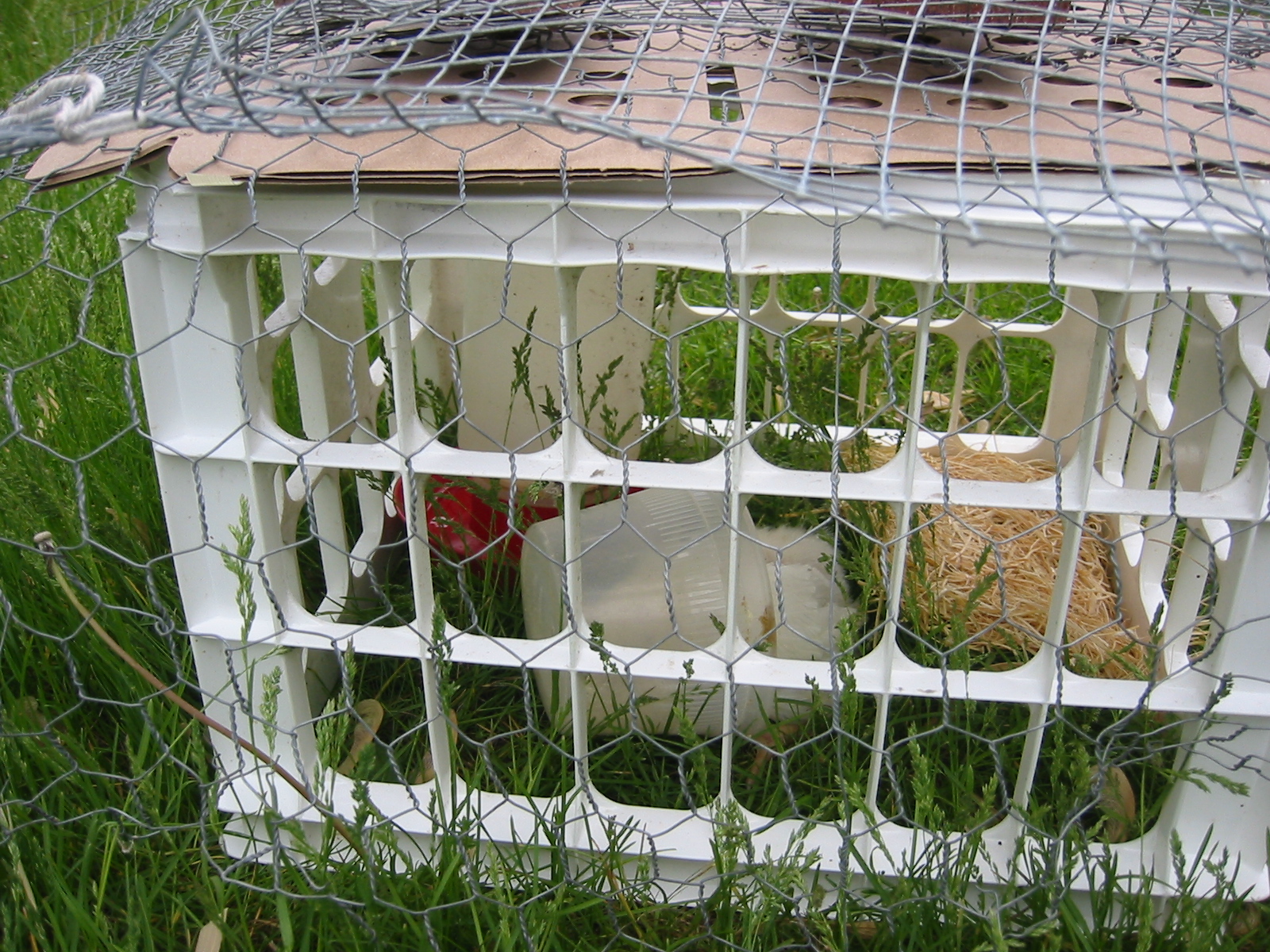 This is a picture of our milk crate hospital pen, there is a chicken in there in the middle of the shot, halfway into a cup holding feed. That's about as big as they got from that first batch.