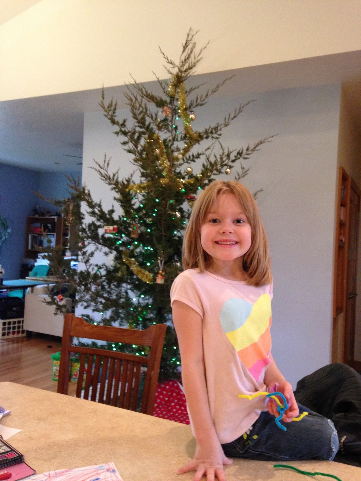 For Christmas, we did our traditional tree hunt, which meant trekking into the pasture and chopping one down. It definitely had a very seedy look to it, but it worked! (and there's my ham of a daughter being a camera hog.)